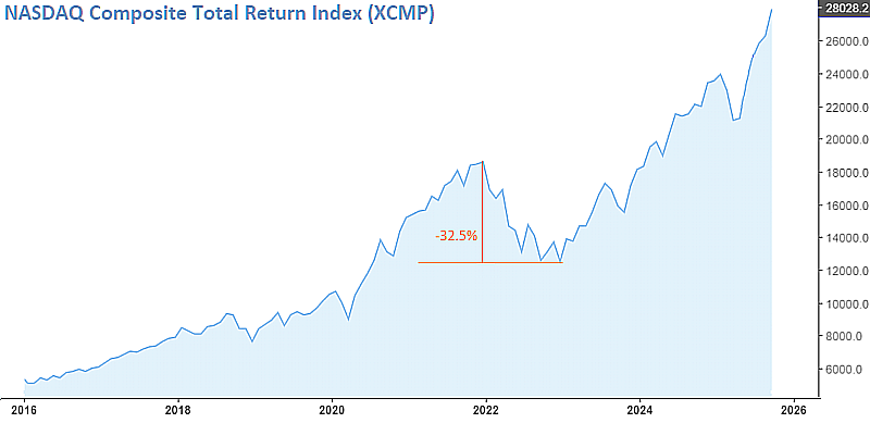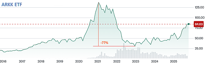 Так устроена человеческая природа, что люди склонны забывать плохое и не извлекать уроков из прошлого. Это правило касается и фондового рынка, где стоимость таких уроков часто бывает очень высока из-за потерянного времени. Длительный рост рынка рождает новых звёзд из числа управляющих и консультантов, успехи большинства из которых заканчиваются эпичным крахом. В этой связи очень показательна история Кэти Вуд - техноаналитика и управляющей фондом ARKK, который в течение 2017-2021 годов прирастал в среднем на 65% в год. Что-то пошло не так в конце 2021 года, когда падение котировок Nvidia спровоцировало мощное падение техносектора. За 4 последующих года котировки ARKK восстановились до уровня декабря 2021 года, а средняя доходность за период с начала 2017 года по сентябрь 2025 года составила 20.7% годовых. За это же время полная доходность индекса Nasdaq составила 21.5% при максимальной просадке в 32.5% против 77% у ARKK.