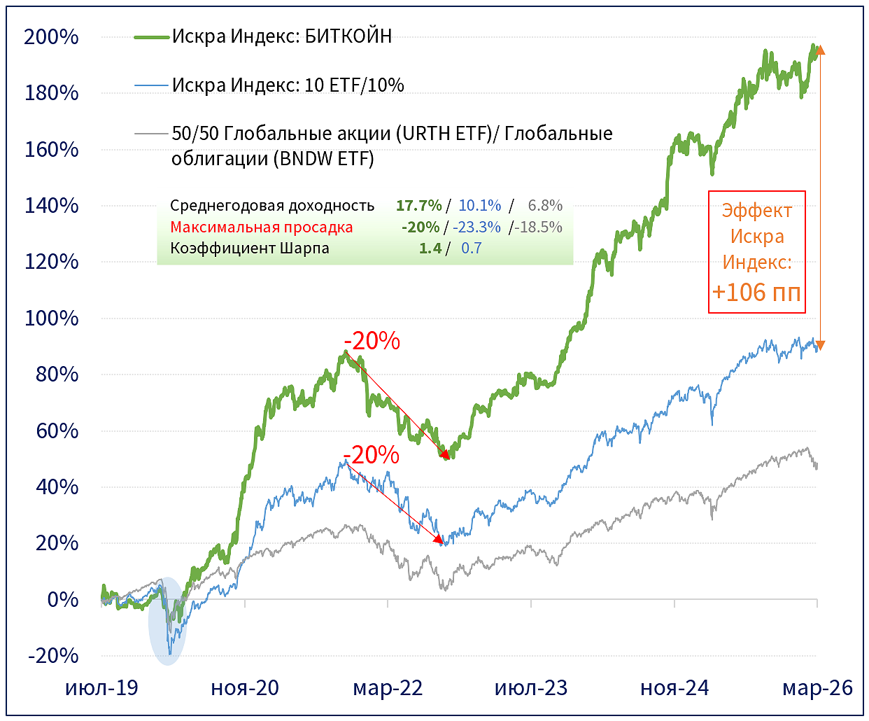 За тот же период 2021-2022 гг. консервативный портфель Депозит+ снизился на 9.5%. Если бы в конце 2020 года на пике ARKK инвестор объединил (даже без оптимизации) инвестиции в ARKK, ограничив их 20%, и портфель Депозит+, то за этот период его совокупный портфель потерял бы 24%, оставаясь в границах разумных потерь и сохраняя возможность быстрого восстановления: