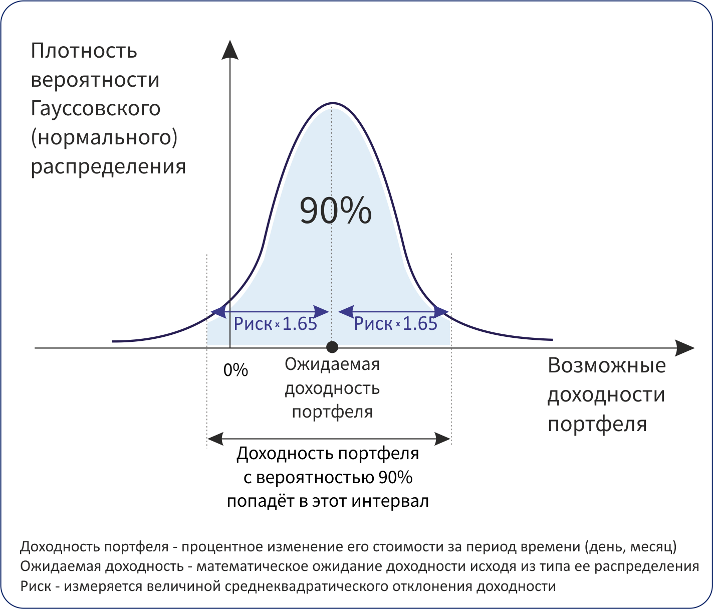 Главное преимущество гауссовского распределения состоит в том, что оно полностью описывается двумя параметрами - математическим ожиданием и дисперсией. В финансовых терминах, это средняя доходность актива и его средний риск (среднеквадратическое отклонение) за определённый временной период. 90% возможных доходностей в гауссовском распределении укладывается в диапазон ± 1.65 среднеквадратических отклонения от среднего значения, и с течением времени он сужается в относительном выражении относительно среднего значения.